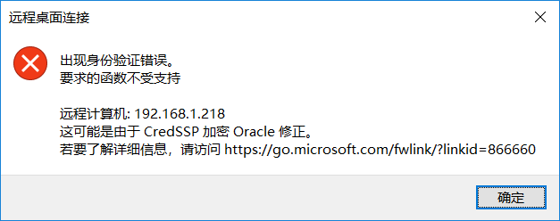 远程桌面连接(出现身份验证错误。要求的函数不支持)这可能由于CredSSP加密Oracle修正。